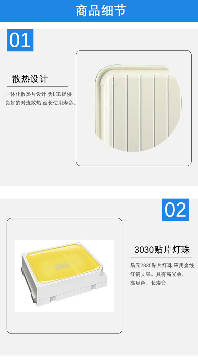 3.晶元2835貼片燈珠,采用金線紅銅支架。具有高光效、高顯色、長壽命。
